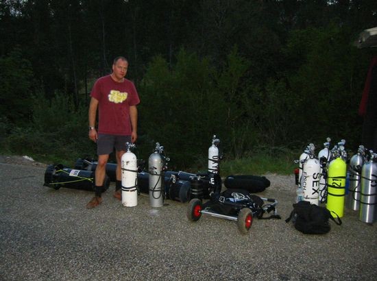 Wir machten an diesen Wochenende noch den frustranen Versuch in der St. Sauveur zu tauchen, wir hatten ja noch einige Stages mit entsprechenden MOD´s und einen Satz Dekogase, das wir einer geordneten Entsorgung zuführen wollen. Nachdem wir uns komplett angezogen hatten und das ganze Zeug im Pool war checkten wir die Sicht. Die Sicht war okay, aber der Flow an der Eingangsrestriktion war so heftig, das die Kiessteinchen herumflogen. No Chance, also das ganze Manöver abgebrochen und die 11 Stages und die 4 Scooter wieder ins Auto und ab nachhause. Sehr schade.