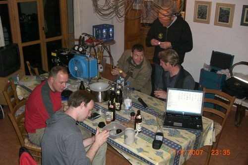 Also ab in die nächste Werkstatt nach Figeac, immerhin eine VW Werkstatt. Hier rechts im Bild Paul unser lieber Freisinger der mit Lilo zusammen die Domaine Gayfie managt. Ohne seine und Lilos Hilfe wäre es mit tauchen nix geworden bei dieser Tour. Herzlichen Dank den beiden dafür! Abends kamen dann noch Michael Reffgen und Günther auf ein paar Bier und Arne bastelte mal wieder fleißig.