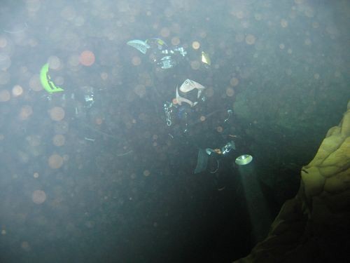 unerheblich nach, so dass wir uns ein bisschen frei graben mussten. Hier machte das mit der von uns mitgeführten Ausrüstung keinen Sinn, bei 95 m Tiefe war die Höhle zu Ende, außerdem war die Spool vollständig abgewickelt. Wir befestigten die Spool, hinterließen einen Cookie und traten den Rückzug an. Auf dem Rückweg gingen wir es gemütlich an, genossen noch einmal das ständig wechselnde Gesicht dieser sehr schönen Höhle. Nach 15 min O2 Deko im Pool war tauchten wir nach 175 min schließlich auf.