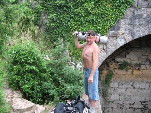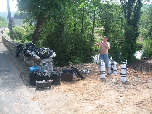 Nachdem wir den TG in der St.Sauveur gecancelt hatten, entschieden wir alle gemeinschaftlich am nächsten Tag in der Source de Landenouse zu tauchen, da diese nach Berichten von Günther und Michi sehr gute Sichtbedingungen um etwa 20-25 m hatte. Roland und ich planten hier mit den Rebreathern und jeweils 2 Scootern das Ende der Leine in Angriff zu nehmen.