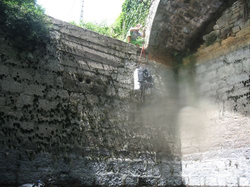 Bisschen Equipment am Pool , rechts im Bild der Flaschenzug zum abseilen der Ausrüstung. Das Wasserlevel war leider etwa 5 m unterhalb der Mauerkante