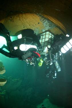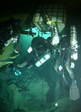 Selbstverständlich gehören in eine vernünftige TG Vorplanung auch klare Definitionen von Limits – harte Limits, die sofort zum Abbruch führen, sowie weiche, die je nach Situation gemeinsam bewertet werden. Mann kann durch eine „eskalierende“ Equipment- und Gasmenge diese Kriterien so verschieben, das man einen erheblichen Spielraum diesbezüglich hat. Da wir nicht wussten, wie das weitere Tiefenprofil der Höhle verläuft haben wir 3 tiefe Trimixstages 12/75 eingeplant, wohl wissend, dass 2 Stages für den tiefen Bereich auf dem Doppel-RB locker ausreichend sind.Nachdem wir mit dem 35/35 abgetaucht waren und gegen die vom Team vorher deponierten Trimix-Stages getauscht und unsere Scooter aufgenommen hatten, fiel mir bereits nach 100m der Reflektor aus dem Lampenkopf – zuerst haben wir dumme Gesichter gemacht, und dann gelacht. Also wieder Retour und den Reflektor getauscht. Auch das wartende Team musste sich die Bäuche halten…