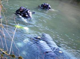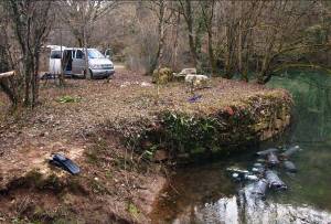Die Neuankömmlinge wollten als erstes in die Cabouy zum Warmtauchen. Als wir am Quelltopf ankamen, waren wir erstaunt, dass der Zaun verschwunden war und das Gebüsch rund ums Wasser entfernt wurde. Wir sind gespannt, was dort passiert.
