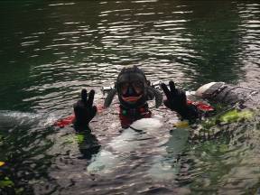 Nachdem wir gemeinsam alles Material in den Pool gebracht hatten, tauchen zuerst Robin und Tibor ab. Bis Peter und Manu 15 Minuten später am Abtauchen waren, kam das erste Team schon wieder zurück und berichtete von 1-1,5m Sicht. Manu und Peter nutzen dann noch den Quellteich, um eine kleine Runde zu drehen.