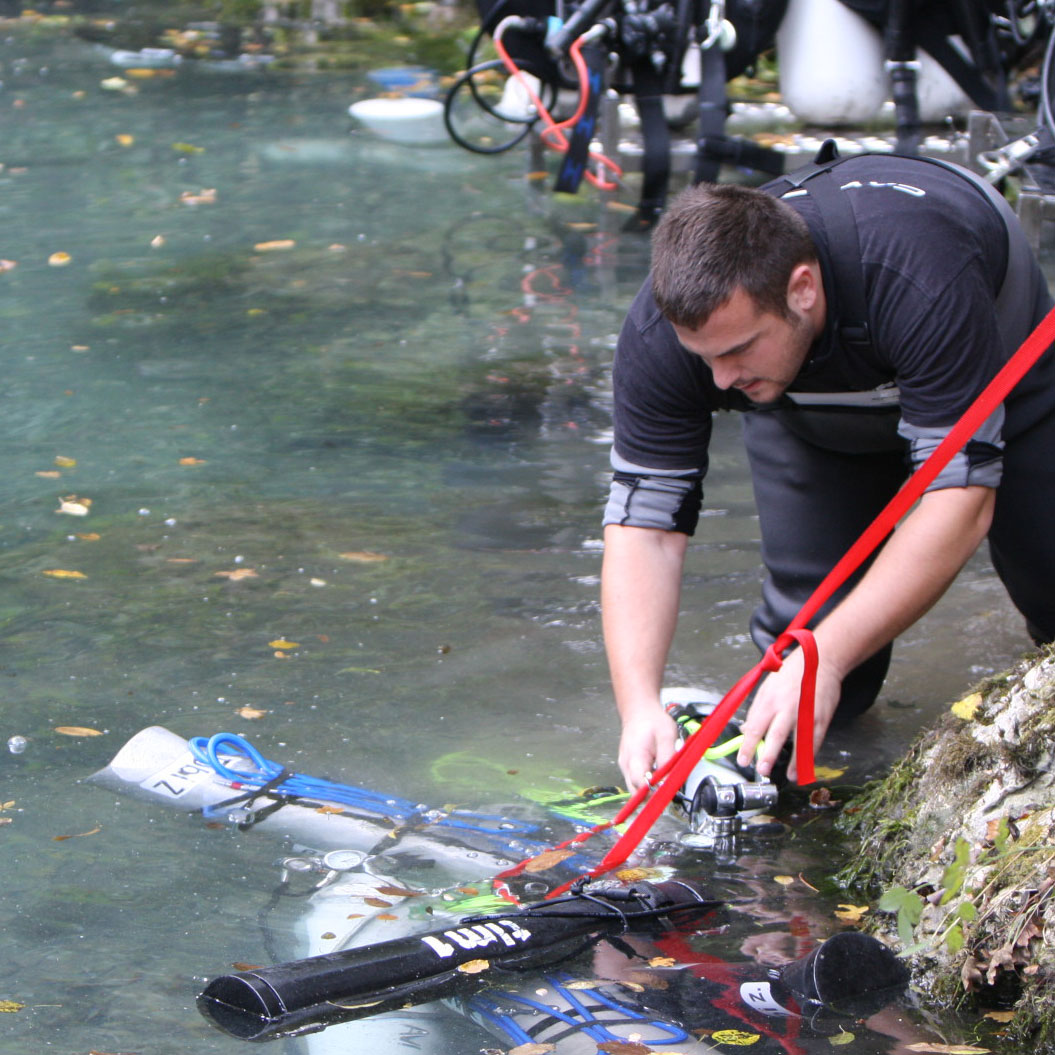 Glücklich über den sich anbahnenden zweiten Erfolg stieg das zweite Team mit voller Montur (D-20 Kreisel und zahlreiche Seitenflaschen) ins Wasser. Den ersten Dämpfer gab es bereits im Höhlenpool, als sofort eine Tauchlampe ausstieg und ausgetauscht werden musste. Drei Restriktionen später war bereits in 21 m Tiefe endgültig Schluss, als Andreas beim dritten Versuch ohne Weiterkommen feststeckte. Es war Zeit, den Tauchgang abzubrechen, zu reflektieren, die Ausrüstung,das weitere Vorgehen in Ruhe zu überdenken und zu besprechen. In aller Ruhe gaben sich die Taucher das Zeichen zum Auftauchen und traten den Rückweg durch die überwundenen Restriktionen an. Auch hier war wieder das Ab- und Umbauen der Ausrüstung nötig, so dass doch bald 40 min vergangen waren, ehe der Quelltopf erreicht war. Damit war es für heute zu spät für einen neuen Versuch.
