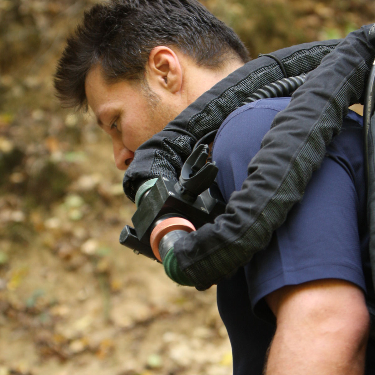 Andreas, der diesen Tauchgang OC durchführte, sah wirklich beeindruckend aus – überall hingen Flaschen, Heiztanks und Scooter. Bei einem derart behängten Taucher ist es nicht mehr möglich alle Seitenflaschen links zu tragen, daher haben wir im Team speziell für diesen Fall einen zusätzlichen D-Ring am unteren Ende der rechten Doppelflasche angebracht. Hier können Flaschen komfortabel eingehängt werden, ohne allzu sehr die Freigabe der Long Hose zu gefährden.