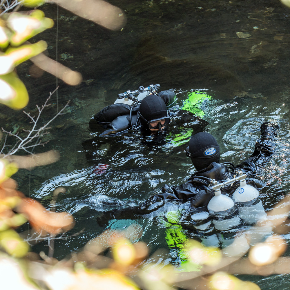 „Ich habe nach dem Briefing einen kurzen Blick in Richtung Eingang geworfen, und festgestellt, dass der Eingang recht komfortabel und groß ist. Wir sind auf 3m abgetaucht um dort unseren Primary Tie Off zu setzen. Auf 6m wurde der secondary tie off platziert und unmittelbar vor dem Eingang zu dieser unbekannten Höhle haben wir unter gegenseitiger Kontrolle nochmals alle Ventile gecheckt.