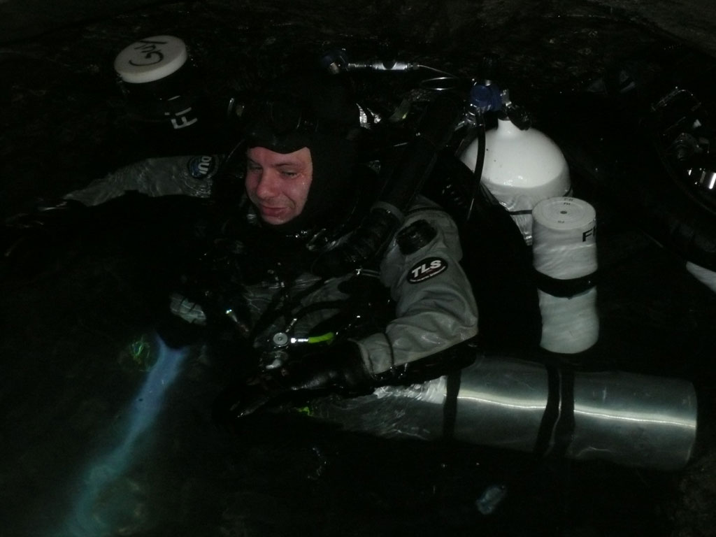 Um zum vereinbarten Rendezvous Zeitpunkt an Ort und Stelle zu sein, sind Oliver und Florian pünktlich um 13:00 abgetaucht. Durch den Setup Tauchgang am Vortag hatten die Beiden eine ziemlich präzise Vorstellung, wie lange sie für den Weg hinter den ersten Knick und den folgenden Aufstieg auf 36m benötigen würden.