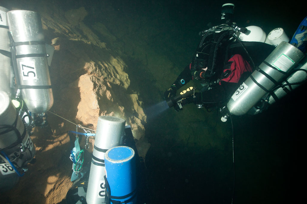 Die beiden hatten es sich zur Aufgabe gemacht das letzte noch fehlende Depot für den Push-Tauchgang anzulegen. Das Depot #5 sollte auf 57m angelegt werden um dort zum einen Reservegas in Form von 18/45 abzulegen wie auch Gase die die beiden Push-Taucher weiter in die Höhle mitnehmen würden (35/35 und 12/60) zu platzieren.
