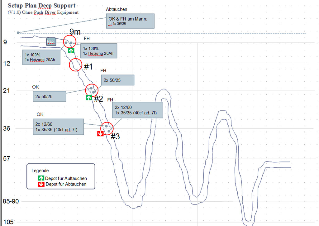 Als nächster Programmpunkt stand ein weiterer Tauchgang von Oliver und Florian auf der Tagesordnung. Dieses mal sollten die beiden den Push-Tauchern entgegentauchen um ihnen die bis dahin nicht mehr benötigte Ausrüstung abzunehmen. Der abgesprochene Rendezvous Punkt befand sich nach dem „ersten Knick“ in ca. 35m Wassertiefe. Start der beiden war so getaktet das sie sich im abgesprochenen Zeitfenster dort treffen würden. Als maximale Wartezeit am Treffpunkt waren 30 Minuten vereinbart.