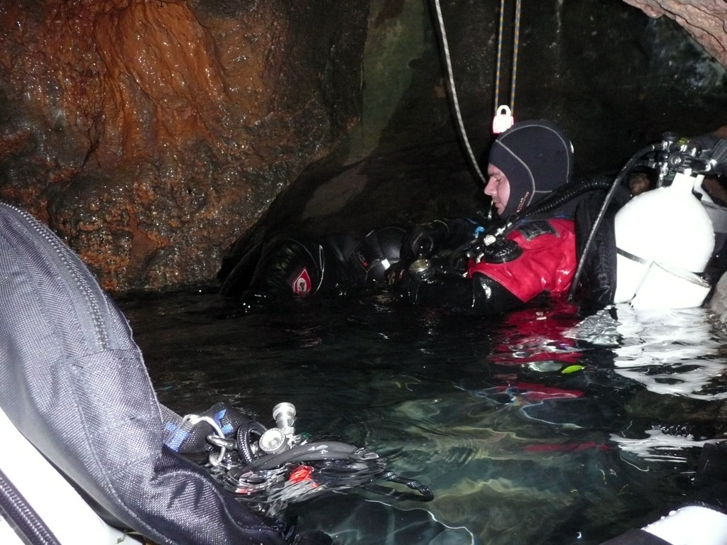 Als zum Ende der Deko, mit dem langsamen Aufstieg begonnen wurde und das Deep Setup Team nach wenigen Minuten die Oberfläche des engen Quellteichs durchstießen gaben sie die vermutete Info über die Pushdiver direkt weiter. Jetzt konnte sich die Supportcrew zum ersten Kontakt fertig machen. Darko unterstützte erst Oliver und dann Florian beim Ablegen der Geräte, damit Platz im Pool geschaffen wurde und die nächsten beiden Kollegen abtauchen konnten um die Infos zur Deko und die hoffentlich erste Erfolgsmeldung von Tobias und Wilke abzuholen. Kurz darauf gingen auch schon die ersten Support Taucher ins Wasser um nach dem Stand der Dinge des Pushtaucher Teams zu fragen und Ausrüstung mit nach oben zu bringen.