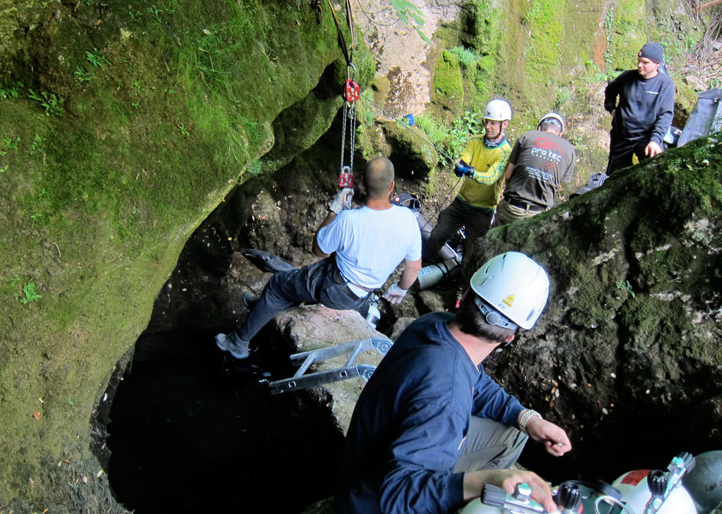 Neben den taucherischen Ansprüchen stellt die Umgebung der Gourneyrou ebenfallseine beachtliche Herausforderung dar. Das Gelände ist sehr unwegsam, der Höhlenpool liegt fast 70 Höhenmeter tiefer als der letzte begehbare Weg. Mittels Seilbahn muss jedes einzelne Ausrüstungsteil zum Höhlenpool befördert werden – und das sind gut und gerne 2Tonnen Gewicht!