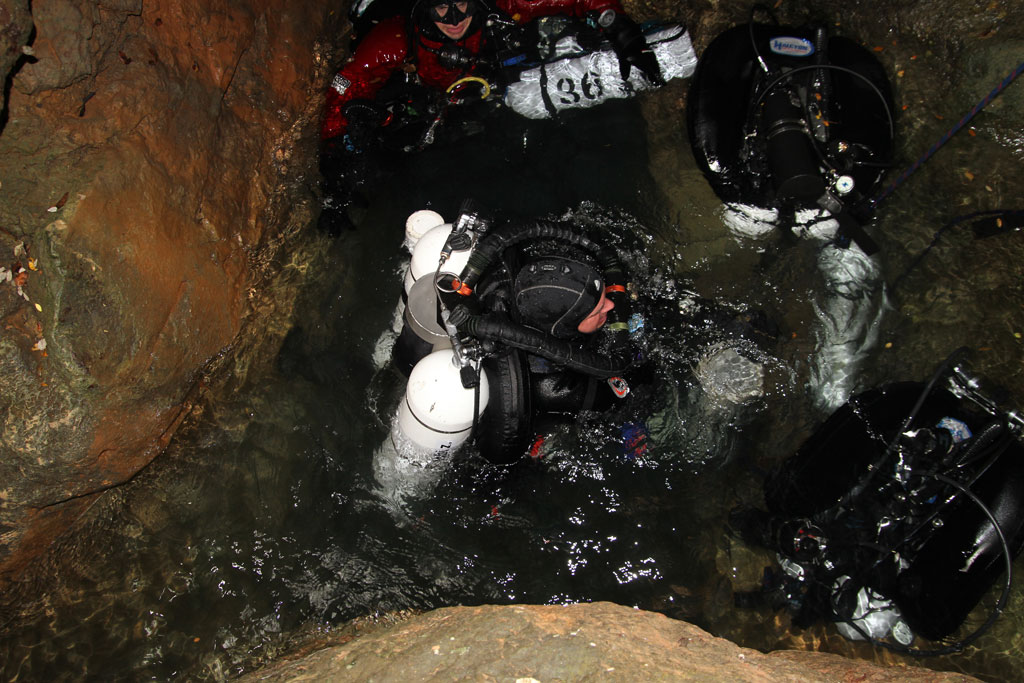 Das tatsächliche Abtauchen fand um 10:00 Uhr, also zwei Stunden später als geplant statt. Tobias und Wilke gaben noch ein kurzes OK Zeichen und tauchten dann für die nächsten 14,5h in die Gourneyrou Höhle ab.