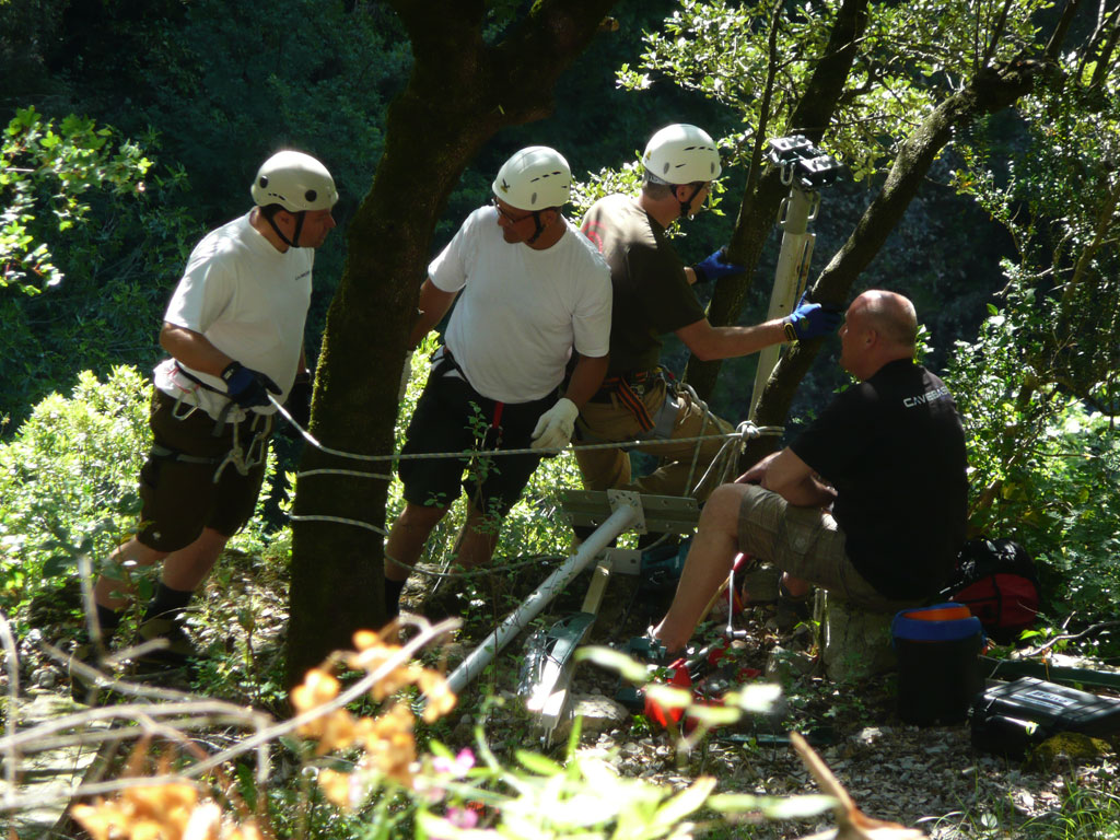Das Lager an sich war diesmal sehr schnell eingerichtet, Latrine ausheben, Sonnenplanen und Regenschutz anbringen, Feuerholz sammeln, Zelte aufbauen, Stromversorgung sicherstellen und das Einrichten der „Abwaschstelle für Geschirr“ verliefen reibungslos und gleichzeitig in Rekordzeit. Gegen 22:00 Uhr verabschiedeten sich bereits die ersten Teilnehmer. Tagesziel für den ersten Projekttag: Seilbahn aufbauen und das Equipment zum Höhlenpool befördern. Hört sich einfach an, hat es aber in sich. Die Berg-, Mittel- und Talstationen wurden mit „Personal“ besetzt und jede Station hatte die Aufgabe die Teile der Seilbahn anzubringen die für diesen Standort relevant waren. Florian, Andreas und Guy kümmerten sich um die Talstation; Benjamin, Oliver, Marc und Wilke um die Mittelstation und der Rest befand sich an der Bergstation.