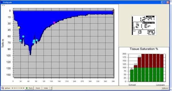 Bei Minute 135 erreichten wir den 36m Punkt und wechselten auf unsere erste Dekostage 35/35. Die weitere Deko, die ereignislos verlief, hatten wir mit GFlow 10% und GFhigh 140% berechnet. Als wir die 6 m Sauerstoff deko beendet hatten, war es leider schon wieder dunkel. Nachdem wir noch ein wenig relaxten, räumten Stefan und Markus bereits die Scooter und Stages zum Auto. Vielen Dank dafür Jungs.