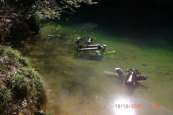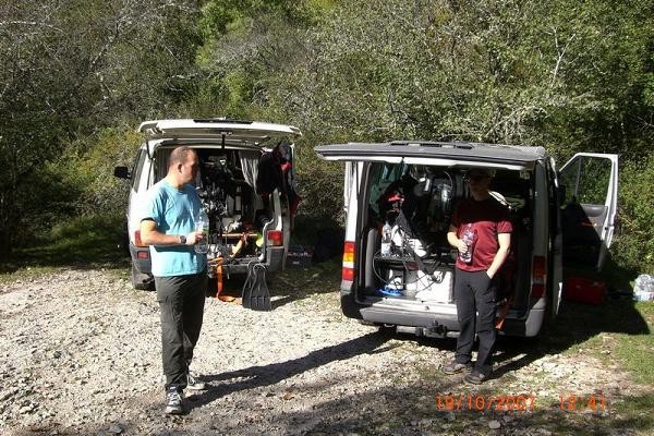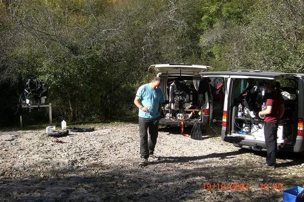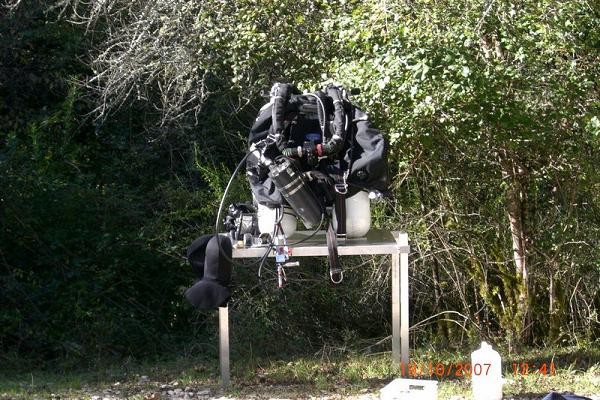 Nachdem wir unsere Planung an der Gourneyras zu tauchen über den Haufen werfen mussten, setzten wir ins Lot über und checkten Donnerstag die St.Sauveur hinsichtlich Flow und Sicht. Bei etwa 12 m Sicht und null Flow entschieden wir uns am kommenden Tag dort zu tauchen. Da wir ja die D20 der Rebreatherframes für die Gourneyras gefüllt hatten, max Tiefe 105m,entschieden aufgrund des Trimix 13/75 in den D 20 Bailouttanks auf eine maximale Tiefe von 105m.