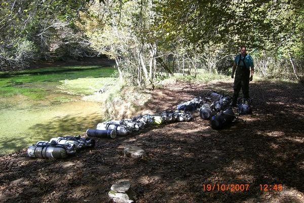 Den TG selbst führten wir mit jeweils 2 Magnum-Gavins und 2 Standard-Gavins (2 Backup’s) durch. Bei Überschreitung einer Tiefe von 80 m kamen selbstverständlich Aluhecks zum Einsatz. Das Gas im Rückengerät diente ausschließlich als Reservegas, als primäre Gasquelle kamen ausschließlich Stages zum Einsatz. Wir setzten für den „flacheren Teil“ bis 80 m jeweils 80 cft Stages mit Trimix 17/60 und für den Bereich jenseits der 80 m ein Trimix 13/75 ein. Zur Dekompression verwendeten wir bewährte Standardgase in 80 cft Stages in Form von Sauerstoff O2, 50/25 und 35/35. Da der TG lediglich mit 5 Stages einem Heiztank und 2 Scooter pro Mann durchgeführt wurde, verzichteten wir auf einen Setup-TG und warfen die Sauerstoffstage bei 6 m und die 50/25 sowie die Heiztanks bei 21 m im Quellpool ab. Nach Passage der Eingangsrestriction scooterten wir zügig auf 36 m und deponierten dort das 35/35 und wechselten bei Minute 20 auf die erste Trimixstage mit dem 17/60.